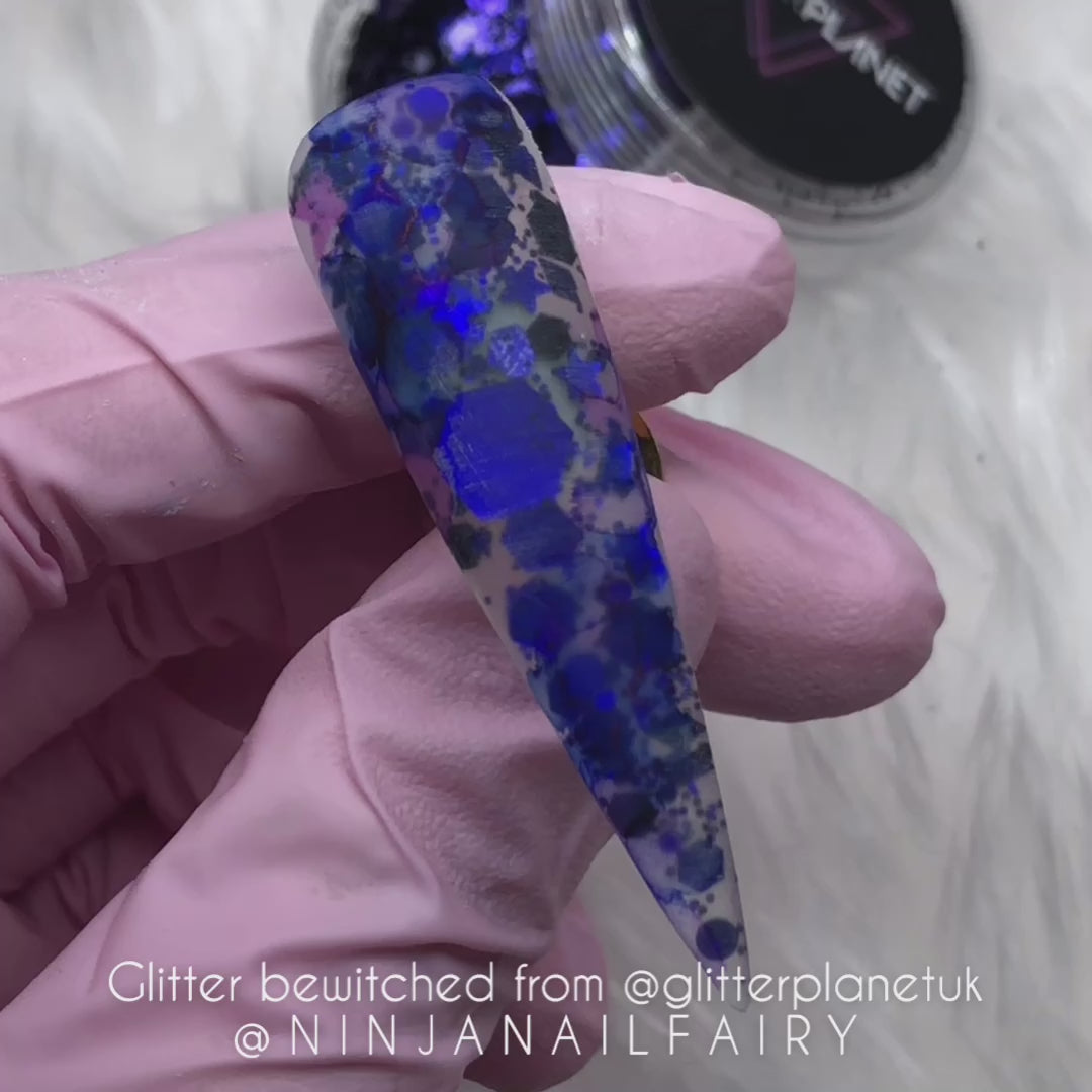 Bewitched is beyond magical, this multi mix chunky glitter is packed with shapes. The base colour is black and it shifts to a fluorescent UV blue glow depending on the angles and lighting.