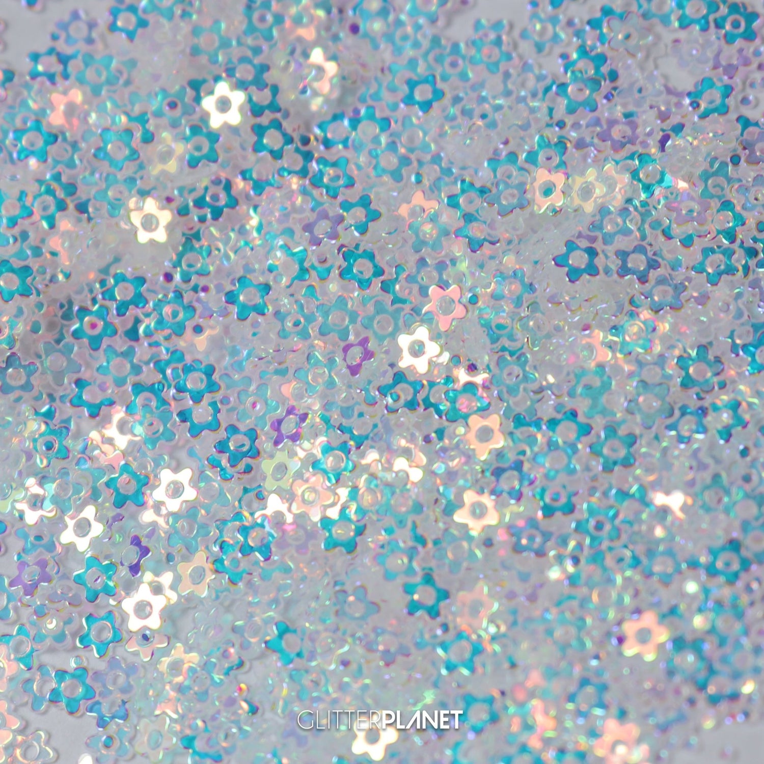 This 3mm flower (daisy) shaped glitter is a super easy way to add nail art sequins to your nails, in such a beautiful Aurora colour. The glitter can be used with polish, Gel or Acrylic.