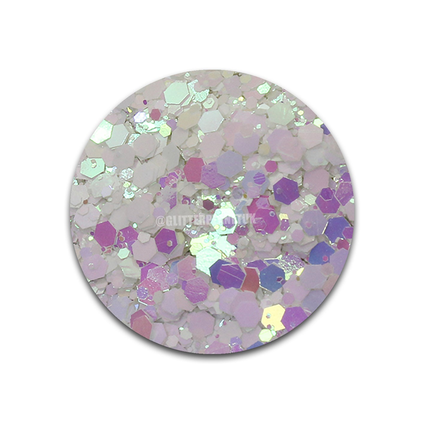 White base glitter mix with iridescent colour shifting finish. Depending on what light you look at this glitter will determine how it looks, it's so beautiful.